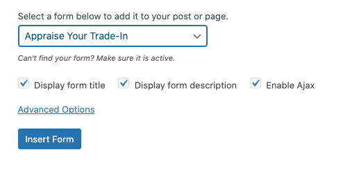 Select the form you would like to be added to the page from the drop-down selection. After you have made a selection, you can choose whether or not to display the form title and description. Before you continue, ensure you've selected Enable Ajax. Once done, select Insert Form.